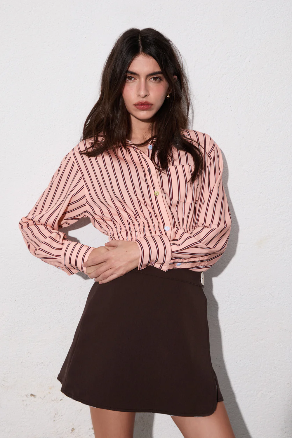 Blusa con pequeño engomado en la cintura y con efecto peplum. Detalle de botones de colores.