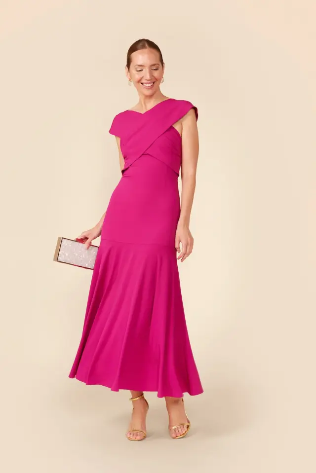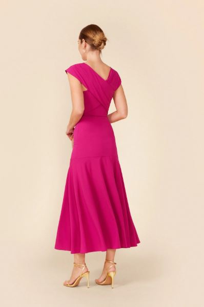 Vestido midi para bodas y fiesta. Confeccionado en tejido tipo crepe muy cómodo. Escote tipo bardot muy elegante. Tejido de crepe elástico. Composición | 92% polyester 8%spandex