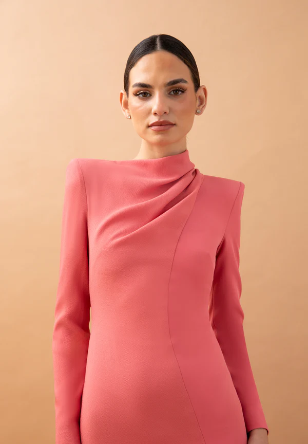 Vestido midi asimétrico que combina en tejidos con drapeado que envuelve el cuello.